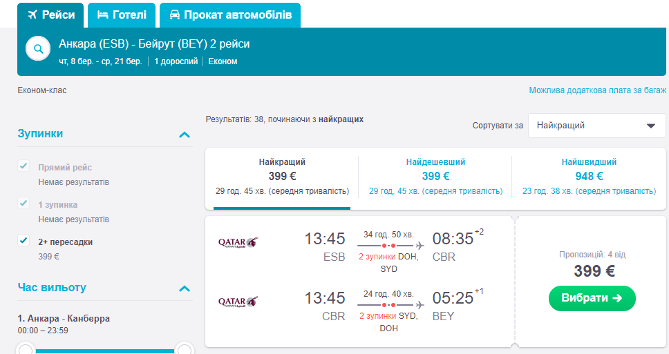 Хоч і ціна зовсім не бюджетна, проте і така ціна є велика рідкість для перельоту з Києва до Австралії ( та й для перельотів з Європи це хороша ціна). По дорозі будуть додатково стиковки в Афінах, Анкарі, Досі та Сіднеї. Стиковка в Лівані ( Бейрут) буде доволі тривала ( 3 дні), тому ми рахуємо це як частину подорожі.