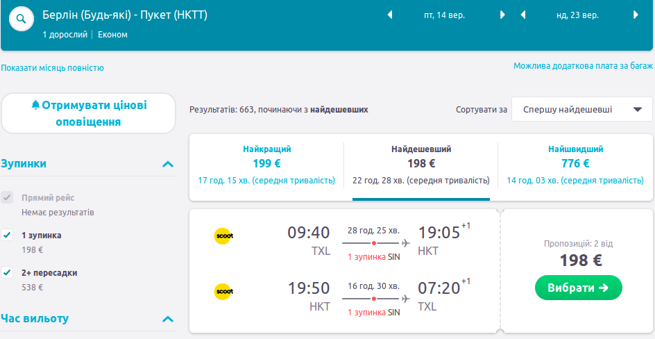 Назва авіакомпанії: Scoot ( в ціну включено лише ручний багаж ).