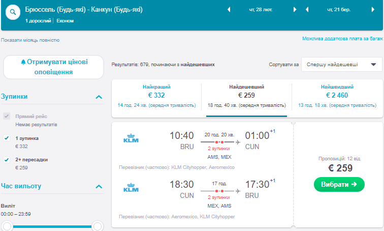 Більше доступних варіантів можна знайти на пошуковику SkyScanner, шукаючи перельоти Брюссель-Канкун на лютий-березень наступного року.