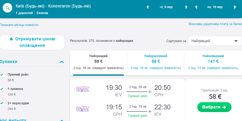 Назва авіакомпанії: Wizzair ( в ціні лише ручний багаж).