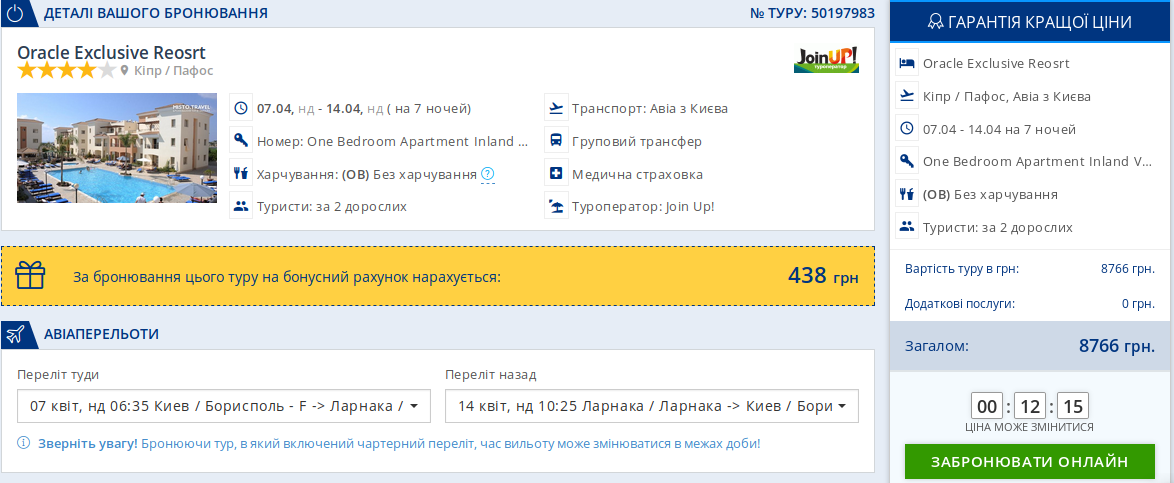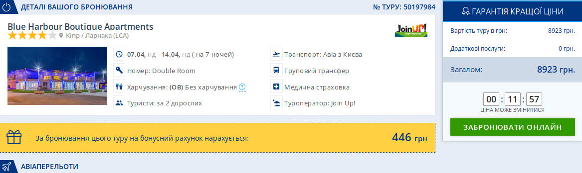 В ціну включено: переліт в дві сторони з багажем з Києва до Ларнаки, трансфер до готелю, медичне страхування.