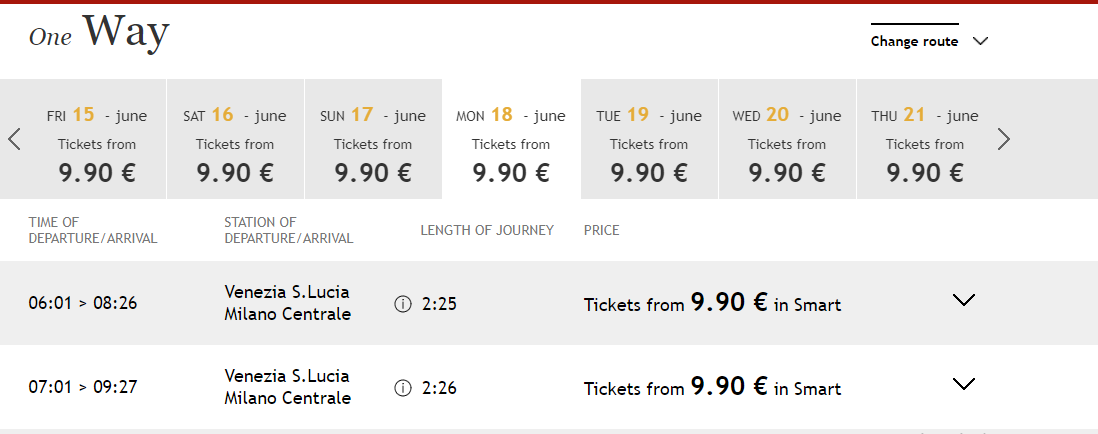 – Потяг Венеція-Мілан можна купити по ціні 10 Євро на будь-яку дату на сайті Italotreno.