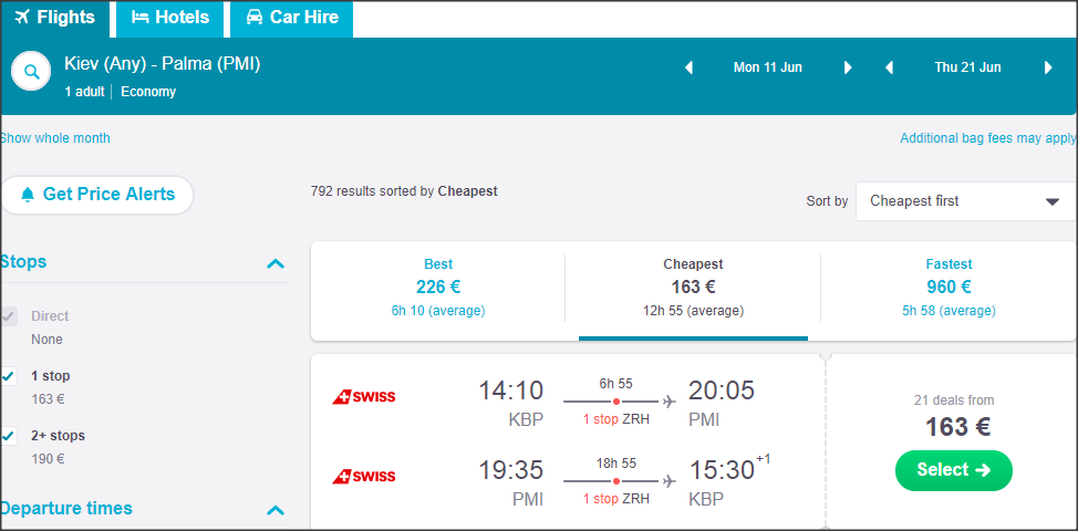 Рейс виконується компанією Swiss до Пальми з стиковкою у Цюриху, назад один із варіантів компанією Lufthansa із зупинкою у Мюнхені.
