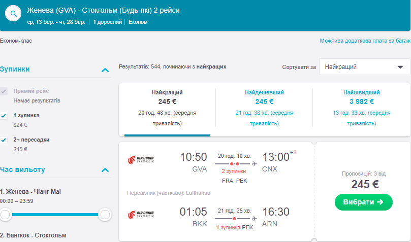 А на березень-квітень 2019 року всього за 60 Євро можна купити Київ-Женева + Стокгольм – Київ. Такі варіанти є на кілька днів у березні та квітні, дивіться приклади резервацій нижче.