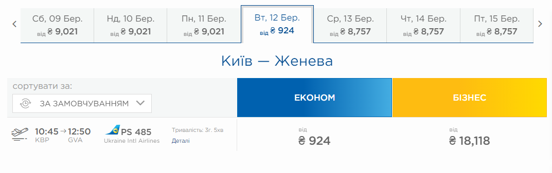 – Київ – Женева 12 Березня + Стокгольм – Київ 29 Березня 60 Євро на офіційному сайті МАУ.