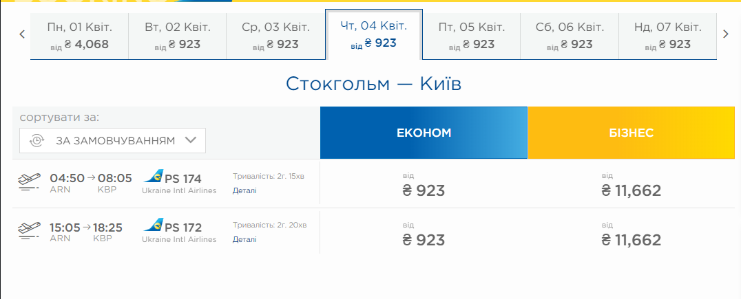– Київ – Женева 18 Березня + Стокгольм – Київ 4 Квітня 60 Євро на офіційному сайті МАУ.