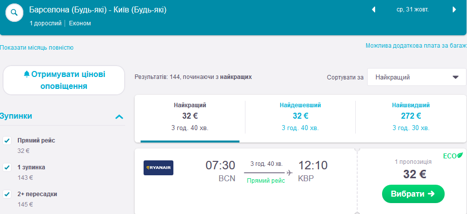 Проте не все так гладко – квитки чудові для покупки суто One-Way сегменту, якщо нас цікавить переліт з Києва до Барселони та назад, вартість буде 64 Євро – що теж крута ціна!