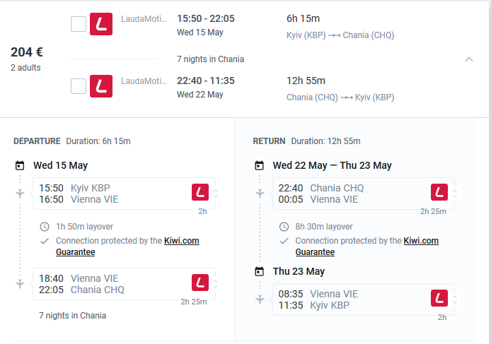 Якщо ви упустили нагоду купити дешевий переліт від Elinnair чи Aegean Airlines до Криту, то у вас є, можливо, last chance, купити дешеві квитки від Laudamotion з хорошими стиковками у Відні ( супер коротка стиковка на шляху туди, та 8-годинна стиковка на зворотньому шляху).