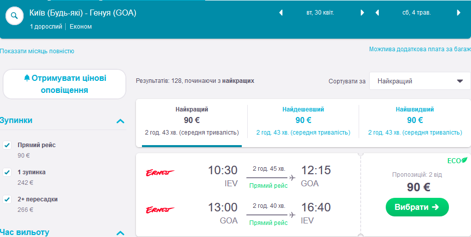 23 Березня відбудеться перший рейс від Ernest Airlines на маршруті Київ-Генуя. Рейси виконуватимуться щовівторка та щосуботи.