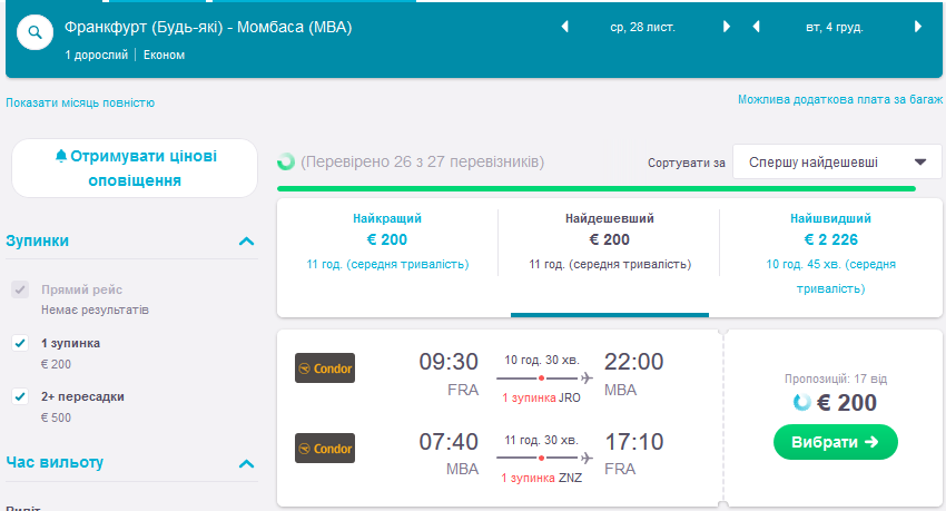 – Київ – Франкфурт – Київ 27 Листопада – 5 Грудня 89 Євро https://bit.ly/2AGFpKA + Франкфурт – Момбаса – Франкфурт 28 Листопада – 4 Грудня 200 Євро https://bit.ly/2Jxf58J