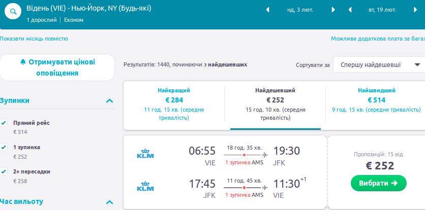 252 Євро – чудова ціна на переліт з Відня до Нью Йорку з авіакомпанією KLM.