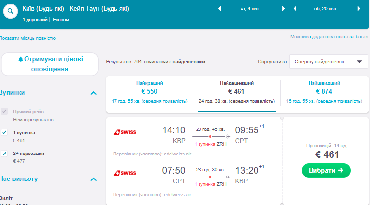 – Київ – Кейптаун – Київ 4-20 Квітня 461 Євро https://bit.ly/2z3vlcv