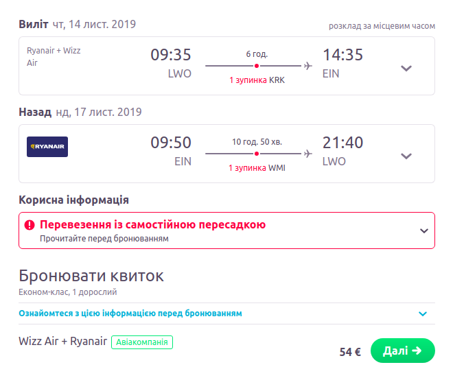 Так, наприклад, два авіаквитки на сегменти Львів-Краків, Краків-Ейндховен можуть коштувати лише 24 Євро!