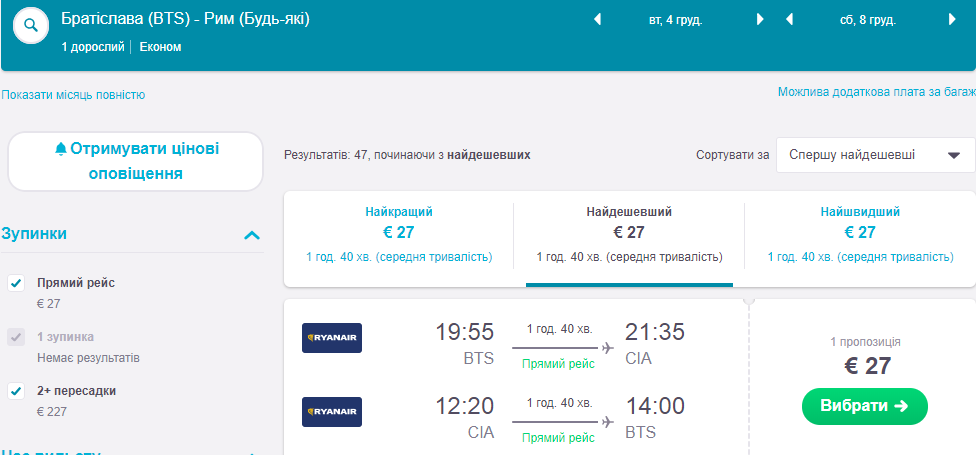 Тут Wizzair вкинув круті ціни на перельоти у листопаді – грудні зі Львова до Братислави. А з Братислави до Риму літає Ryanair теж по мінімальному тарифу. Плюсом такого маршруту є мінімальні стиковки у Братиславі.