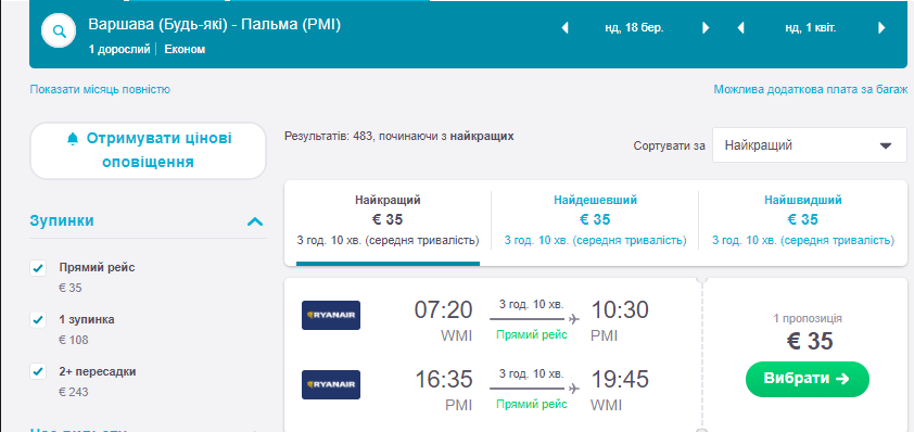Усі рейси виконуються авіакомпанією Ryanair ( в ціну включений лише ручний багаж).