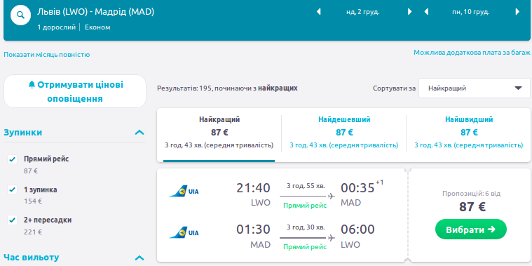 Щоб знайти більше варіантів заходимо на Skyscanner, вбиваємо Львів-Мадрид з вильотом у неділю та поверненням у понеділок 🙂