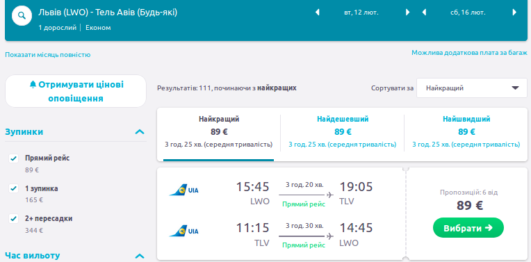 Щоб знайти більше варіантів заходимо на Skyscanner, вбиваємо Львів-Тель Авів з вильотом та поверненням у вівторок або суботу 🙂