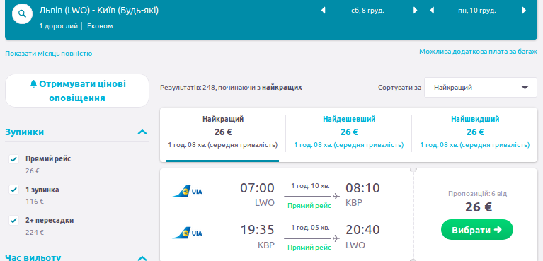 Щоб знайти більше варіантів заходимо на Skyscanner, вбиваємо Львів-Київ з вильотом та поверненням у будь-який день тижня 🙂
