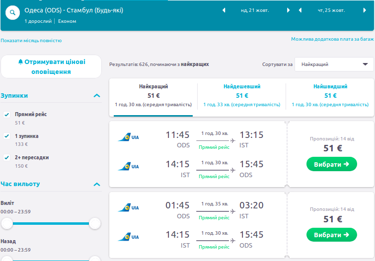 Щоб знайти більше варіантів заходимо на Skyscanner, вбиваємо Одеса-Стамбул з вильотом та поверненням у будь-який день тижня 🙂
