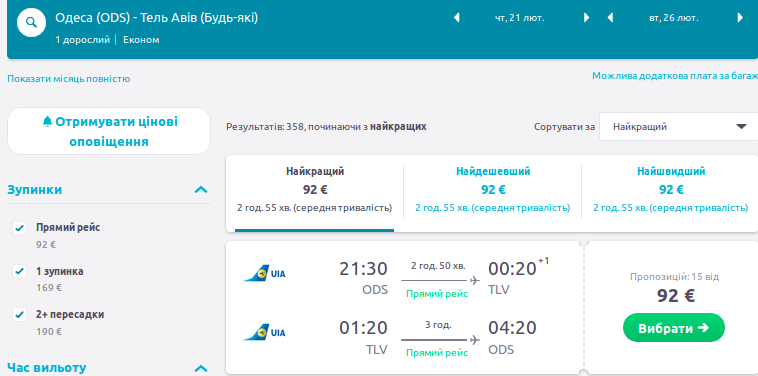 Щоб знайти більше варіантів заходимо на Skyscanner, вбиваємо Одеса-Тель Авів з вильотом та поверненням у між понеділком та четвергом включно 🙂