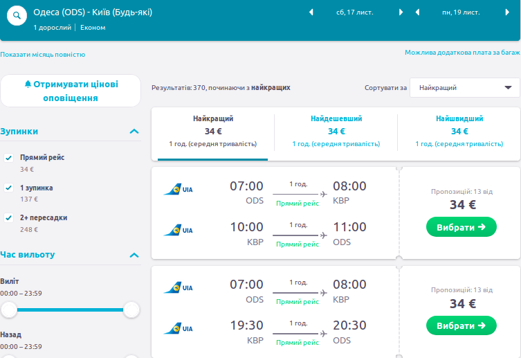 Щоб знайти більше варіантів заходимо на Skyscanner, вбиваємо Одеса-Київ з вильотом та поверненням у будь-який день тижня 🙂