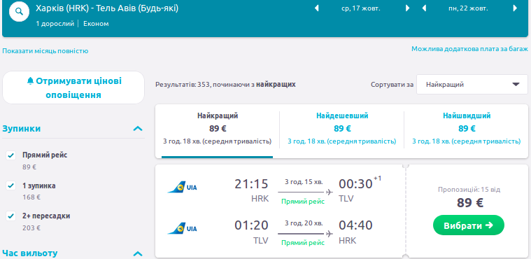 Щоб знайти більше варіантів заходимо на Skyscanner, вбиваємо Харків-Тель Авів з вильотом та поверненням у будь-який день тижня, крім вівторка та п’ятниці 🙂