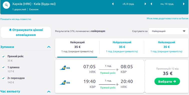 Щоб знайти більше варіантів заходимо на Skyscanner, вбиваємо Харків-Київ з вильотом та поверненням у будь-який день тижня 🙂