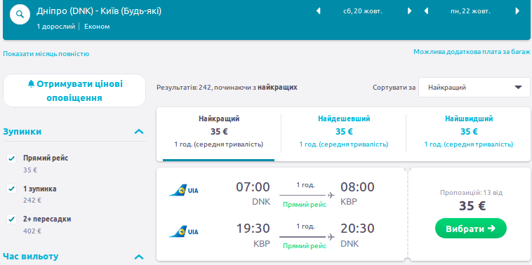 Щоб знайти більше варіантів заходимо на Skyscanner, вбиваємо Дніпро -Київ з вильотом та поверненням у будь-який день тижня 🙂