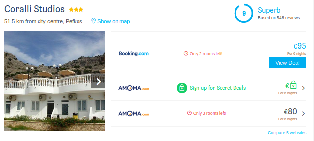 Житло бронюємо у готелі *** з середньою оцінкою 9/10 Coralli Studios на потрібні для нас дати.