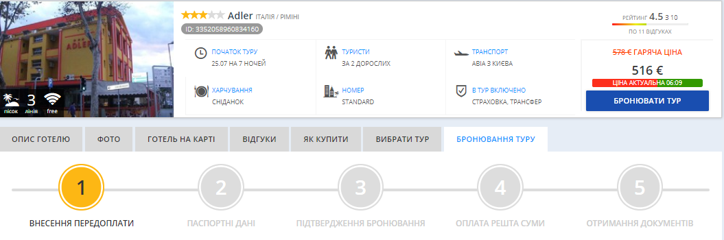 В ціну включено: переліт в дві сторони з багажем з Києва до Ріміні, трансфер до готелю, медичне страхування.
