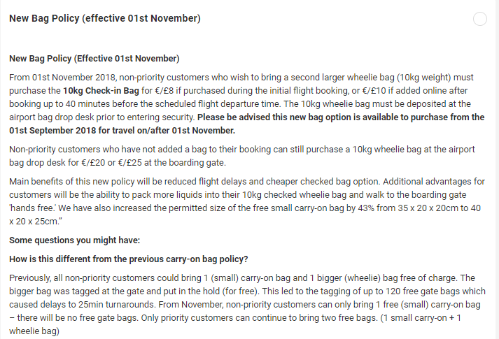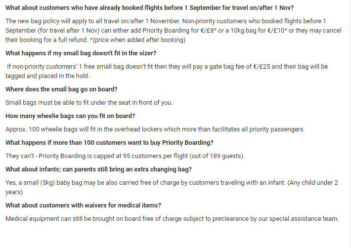 Щоб мати можливість взяти з собою іншу одиницю ручного багажу з розмірами 55x40x20 см, пасажирам прийдеться викупити Priority Boarding, який коштуватиме 6 Євро при бронювання квитка та 8 Євро при проходженні онлайн-реєстрації на рейс.