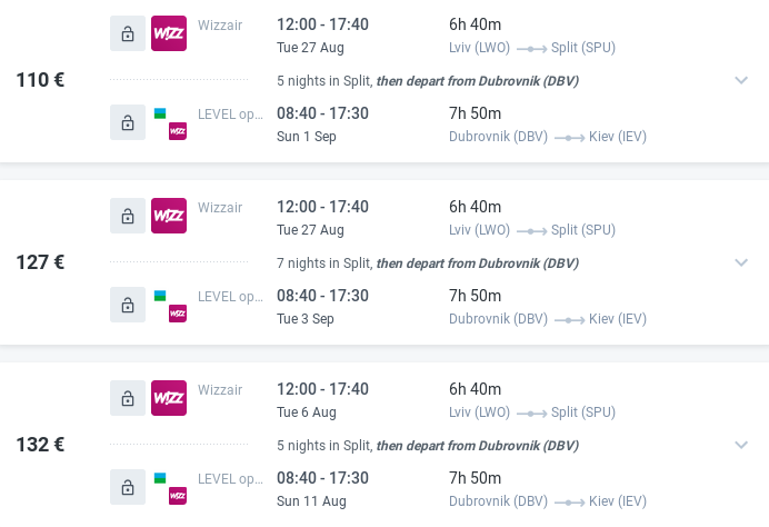 Якщо покомбінувати варіанти від лоукостерів Wizzair та Level, то можна дістатись Хорватії в серпні за розумні гроші, при цьому без транзитних ночівль, як буває в більшості цікавих випадків.
