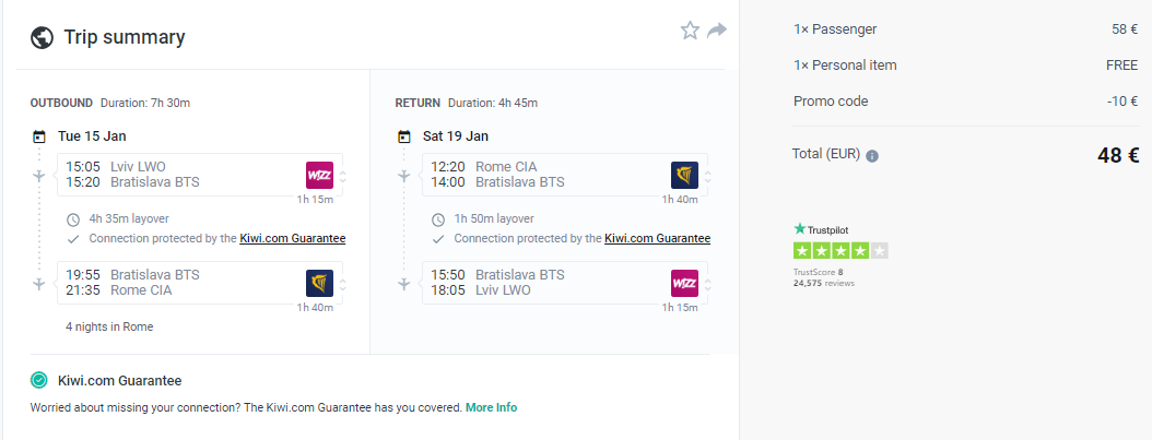 Для отримання знижки у розмірі 10 Євро обирайте цікавий варіант і на сторінці оплати клікаємо “Redeem Promo Code” та вводимо промокод “KIWICOM10” – діє лиша на бронювання вартістю від 50 Євро.