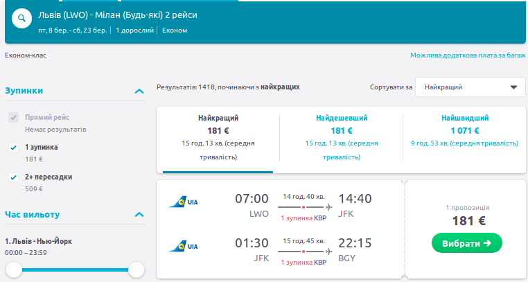 – Львів – Нью Йорк + Нью Йорк – Мілан ( Київ) 8-23 Березня 181 Євро http://bit.ly/2B7fder