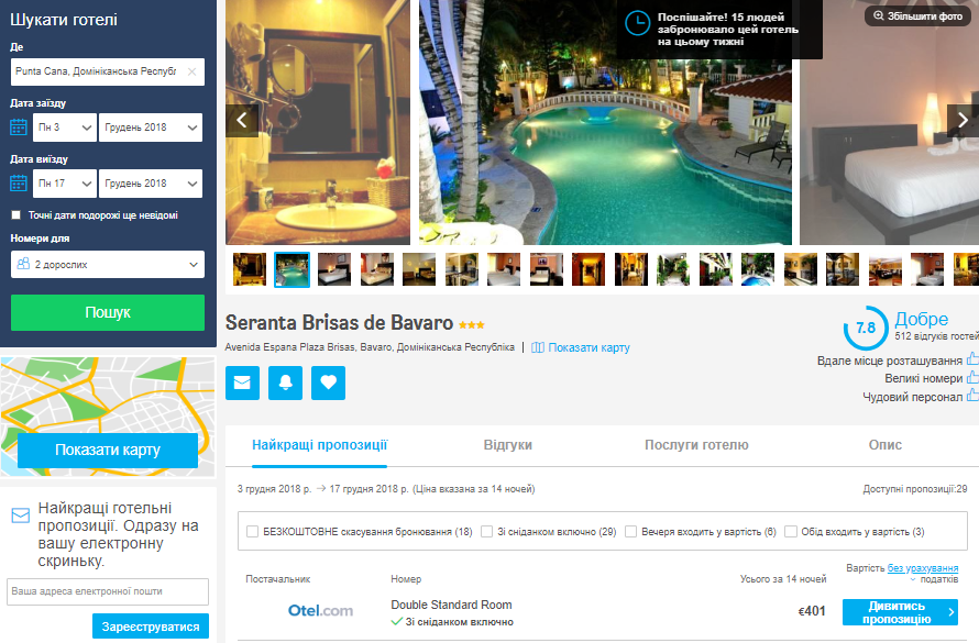 Безліч бюджетного житло на Пунта Кані можна знайти на HotelsCombined ( найдешевші варіанти на 2 тижні стартують від 100 Євро/особа), проте ми б радили звернути увагу на готель Seranta Brisas de Bavaro – *** готель з хорошим рейтингом, понад півтисячі відгуків та включеними сніданками обійдеться всього в 200 Євро з особи!