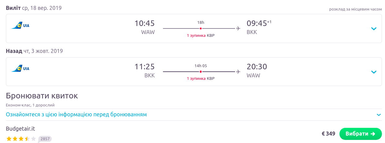Доволі непогана ціна від МАУ на переліт з Варшави в Бангкок – всього 349 Євро в дві сторони. Рейси виконуються зі стиковкою у Києві, проте летіти ми мусимо саме з Варшави, не вийде “підсісти” у Києві.