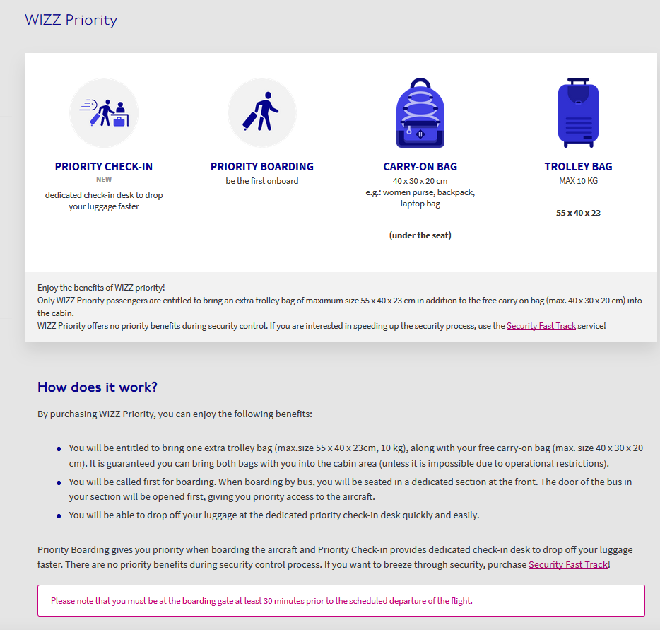 А от багаж зі “старими” розмірами, тобто, 55x40x23 см зможуть взяти в салон лише ті, хто викуплять послугу Wizz Priority. Перевізник запевняє, що вартість цієї послуги починатиметься від 5 Євро. Окрім цього, у вас буде право теж взяти одну одиницю малого ручного багажу!