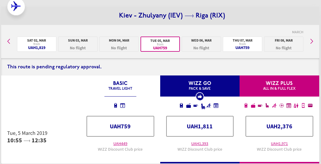 - Київ – Рига (по вівторках, четвергах та суботах, починаючи з 2 березня 2019 року).