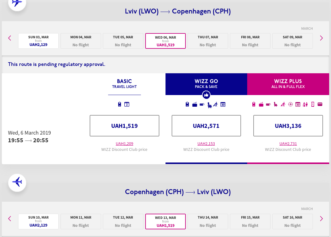 - Львів – Копенгаген (по середах та суботах, починаючи з 3 березня 2019 року).